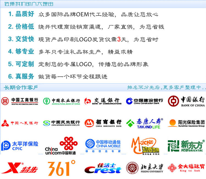 本工廠注重打造產品的品質,服務,客戶的精準貨期,讓客戶下單之后無后顧之憂。銷售網絡已經遍布全國,在全國部分城市設立有辦事處,歡迎空白區(qū)域的禮品商,商超、禮品公司,廣告公司,批發(fā)渠道商合作,共同打造集團化的優(yōu)勢,共創(chuàng)美好未來。